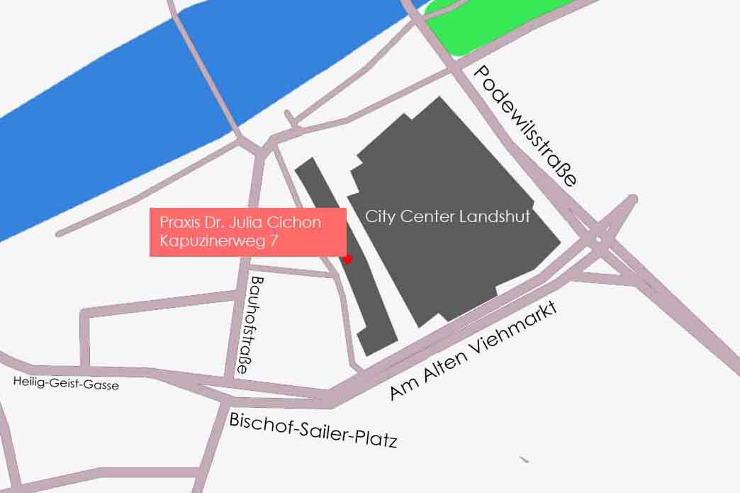 die Kieferorthopädische Praxis Dr. Julia Cichon in Landshut liegt zentral direkt neben dem City Center Landshut. Der Eingang zu